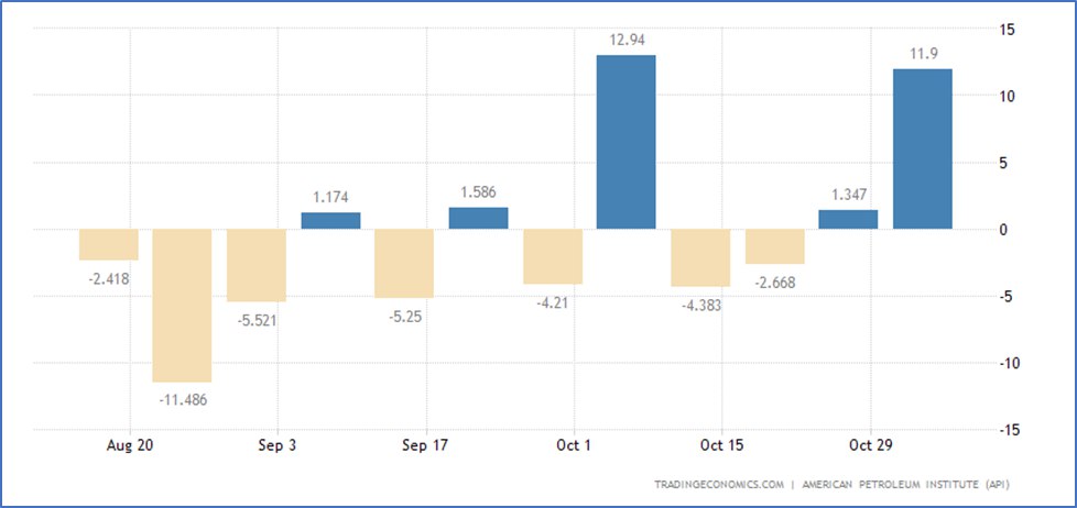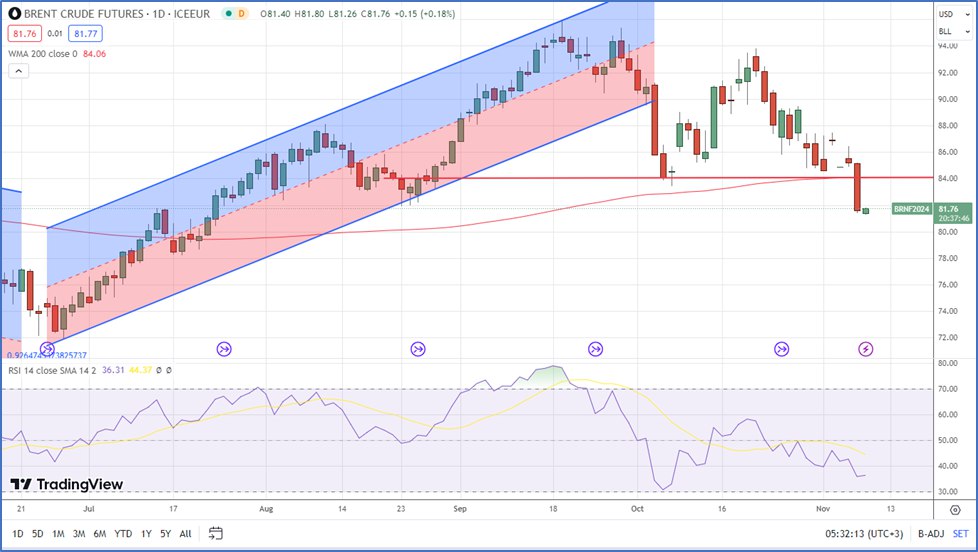 Однако у нас складывается впечатление (можем вполне ошибаться), что рынок придавливают, чтобы не допустить экономических последствий, сходных с нефтяным шоком семидесятых годов прошлого века, так как прослеживается интересная взаимосвязь: обострение палестино-израильского конфликта, как и начало СВО, привело вначале к взлету цен на нефть, а затем к их снижению (размах колебаний не тот, но движение похоже). При этом геополитический риск никуда не делся, оба конфликта продолжаются и сохраняется возможность их обострения (если это произойдет, то логичнее всего, что спрос на нефть и нефтепродукты подскочит).