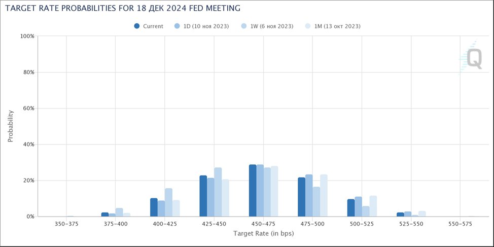 Интересная складывается ситуация: анализ фьючерсного рынка Чикагской товарной биржи (Chicago Mercantile Exchange) показывает, что участники рынка ожидают, что ФРС США в следующем году понизит ставку по федеральным фондам трижды (по 0,25%) до уровня 4,5-4,75% годовых (см. нижеприведенную диаграмму). Сходную позицию начинают занимать и некоторые крупные банки, например, Morgan Stanley и UBS, которая противоречит заявлениям представителей ФРС в духе «higher for longer» о высокой ставке (хотя исторически и 4,5% при инфляции в 2% будет высокой) в течение 2024 года.