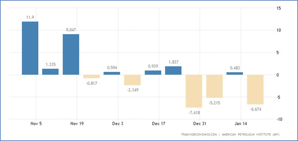 Данные Американского нефтяного института (API) показали очередное резкое сокращение нефтяных запасов (третье за последние четыре недели) – в течение прошедшей недели они сократились на 6,674 млн. баррелей (см. нижеприведенную диаграмму). Учитывая, что с конца декабря министерство энергетики США (в лице EIA) и институт уже трижды расходились в оценке роста и снижения запасов, стоит, конечно, подождать выхода вечером статистики EIA для окончательного вывода. Стратегические запасы сырой нефти в США вновь выросли на 900 тыс. баррелей до 365,5 млн. баррелей.