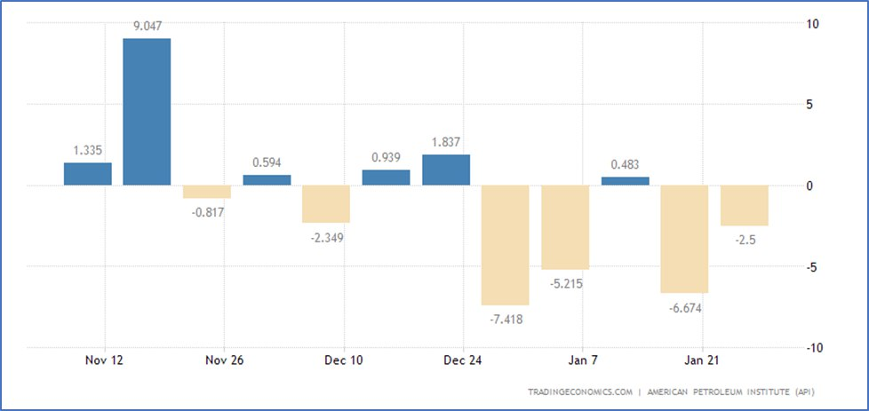 По данным Американского нефтяного института (API), коммерческие запасы сырой нефти в США в течение прошедшей недели снизились на 2,5 млн. баррелей (см. нижеприведенную диаграмму) – это больше, чем прогнозировали аналитики. Стратегические запасы сырой нефти в США продолжают медленно увеличиваться: в данный момент они составляют 366,4 млн. баррелей (+0,9 млн. баррелей за неделю). Вновь выход данной статистики как-то мало повлиял на динамику нефтяных цен, которые пока продолжаются болтаться в районе 200-дневной скользящей средней в ожидании решения президента США в отношении Ирана, обвиненного в нанесении удара по американской военной базе. В данный момент Brent находится на уровне 82,41 долл. за баррель (-0,28%).