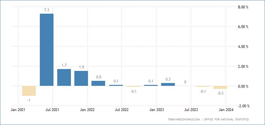 Только что вышедшая в Великобритании статистика показала, что ВВП страны в IV квартале 2023 года снизился на 0,3% (в III квартале снижение составило 0,1%, см. нижеприведенную диаграмму). Таким образом, вслед за Японией техническая рецессия зафиксирована и в Великобритании.